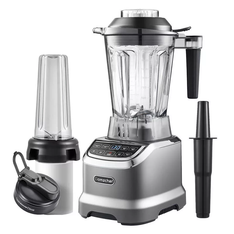 Az AMZCHEF ZM5003-GA poharas turmixgép lenyűgöző, akár 1800 wattos teljesítményt és 1,85 literes űrtartalmat kínál, a pengék pedig akár 26 000 fordulat/perc sebességgel működnek. Ez megkönnyíti a különféle ételek és italok elkészítését - a turmixoktól a krémlevesekig. Sikeresen őrölheti a gabonákat vagy a húst is. Egy további 600 ml-es palackkal az otthonán kívül is élvezheti a finom italokat.