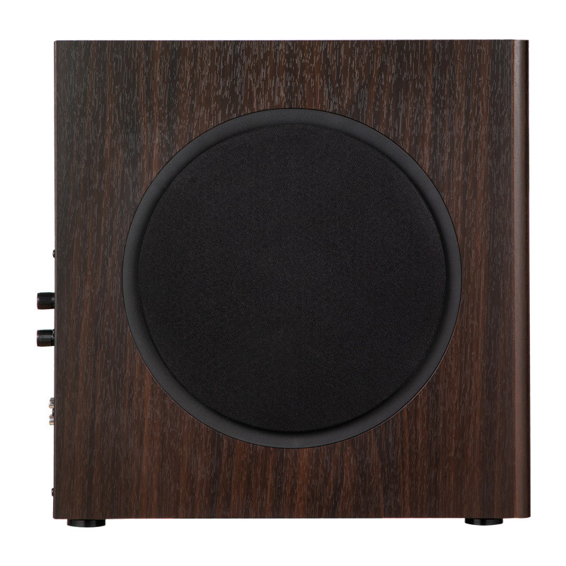 A 18 mm-es MDF (közepes sűrűségű farostlemez) alapú konstrukció minimalizálja a rezonanciákat és a torzítást a precíz és gyors basszusok érdekében. Az alacsony profilú ráccsal ellátott barna fa kivitel esztétikus megjelenést kölcsönöz a mélysugárzónak, amely így bármilyen belsőépítészeti stílushoz illeszkedik.
