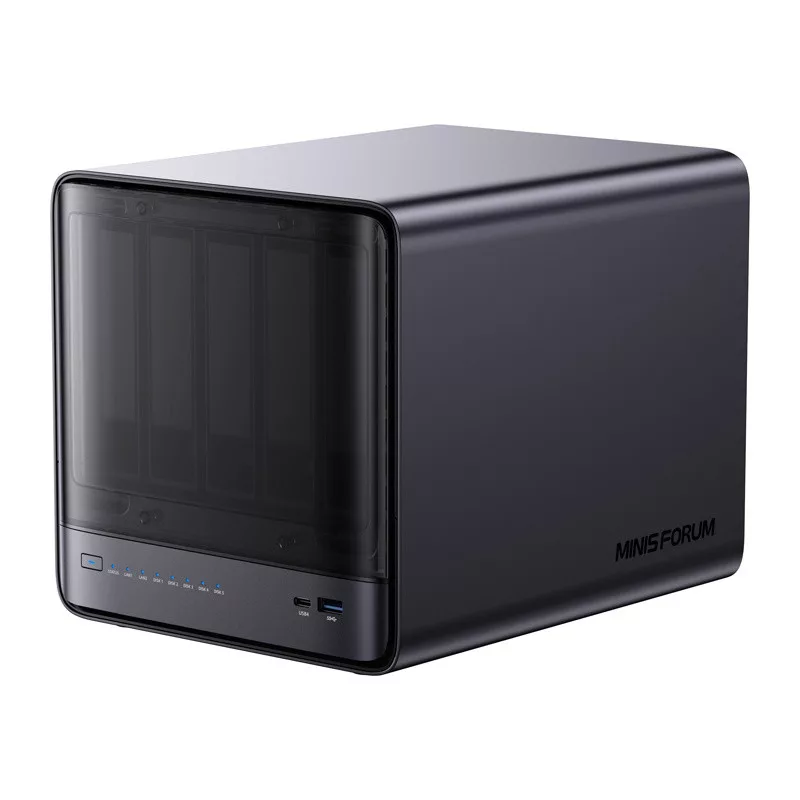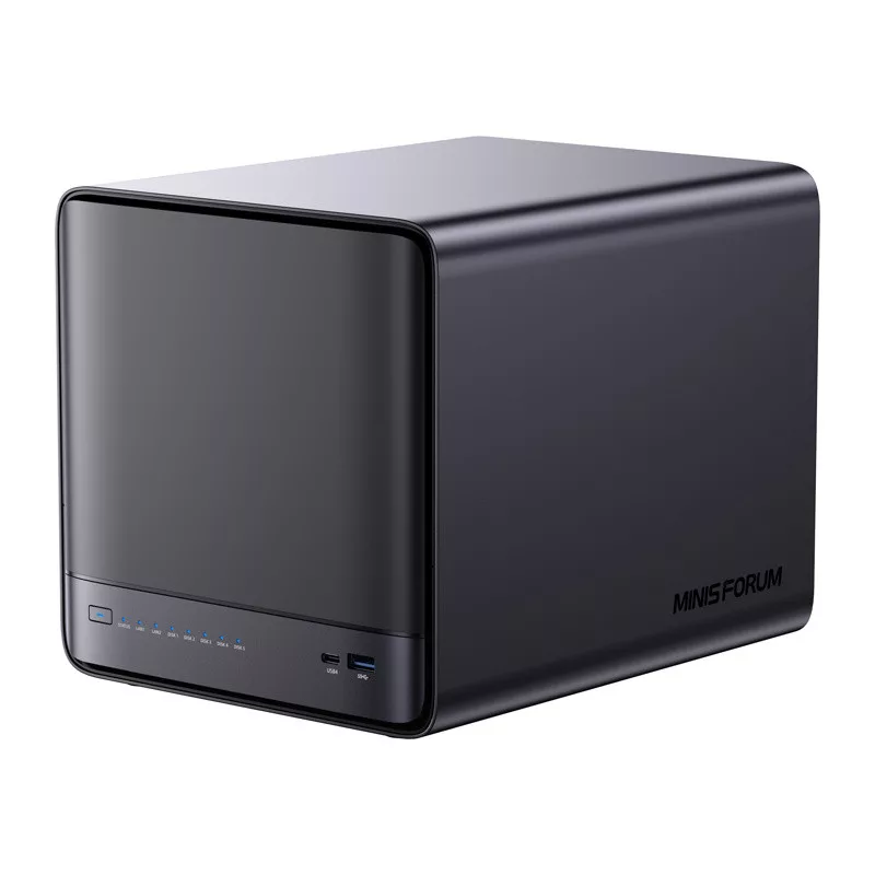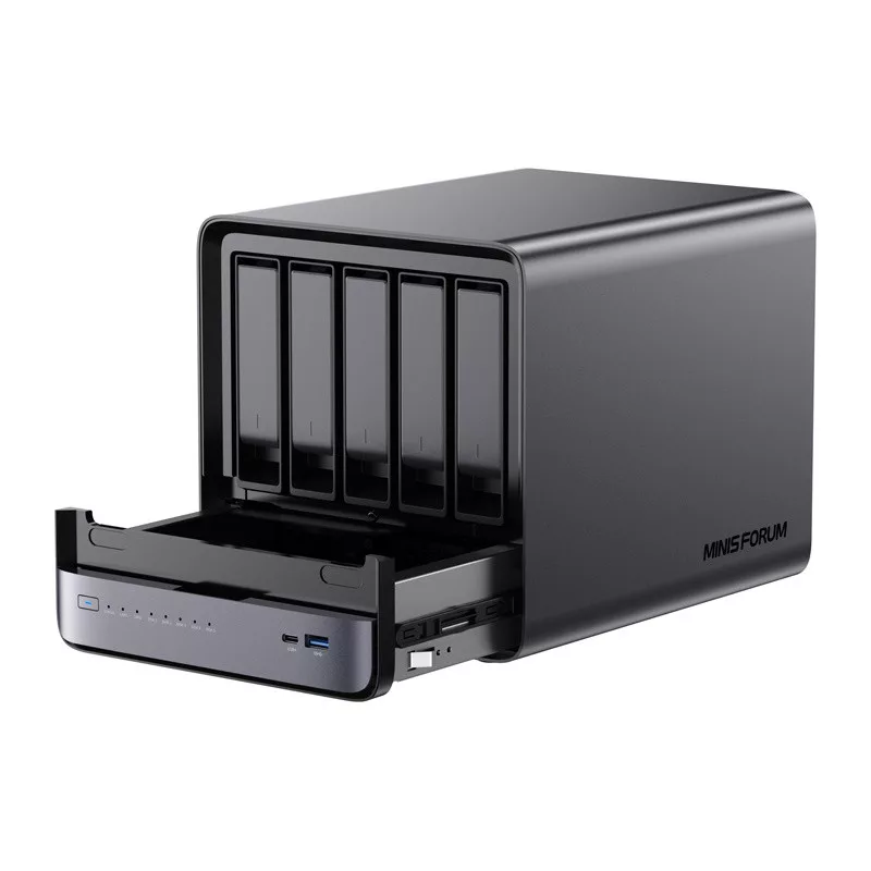 A Minis Forum NAS N5 egy kompakt NAS PC, amelyet olyan felhasználók számára terveztek, akiknek nagy számítási teljesítményre és kiterjedt tárhelyre van szükségük kis méretben. A felhasznált AMD Ryzen™ 7 255 processzor nyolc maggal és tizenhat szálakkal garantálja a nagy teljesítményt a mindennapi feladatok, a virtualizáció, a médiaszerkesztés vagy a nagyméretű fájlokkal való munka során. Az integrált Radeon™ 780M grafikus chip támogatja a videó gyorsítást és a 3D renderelést, így a készülék sokoldalú eszközzé válik a fejlesztők és a szakemberek számára. A készülék akár 96 GB gyors DDR5 memóriát (5600 MT/s) támogat, akár nyolc, összesen akár 144 TB kapacitású adathordozót is támogat, és gazdag portkészletet kínál: 10 GbE és 5 GbE LAN, USB4, HDMI 2.1 és OCuLink. Egy PCIe x16-os bővítőhely további rendszerbővítést tesz lehetővé, a dedikált MinisCloud OS pedig stabil működést és egyszerű adatkezelést biztosít otthoni vagy üzleti környezetben. Mindezt kiegészíti a modern, funkcionális kialakítás, amelyet a hatékony hűtésre és a napi többórás zavartalan működésre terveztek.