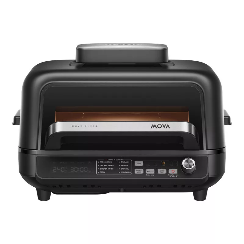 A MOVA IG20 Pro egy intelligens, multifunkcionális elektromos grill, amely egyesíti a zsírmentes sütő és a grillsütő képességeit. Segítségével a szaftos steakektől és a ropogós sült krumpliktól kezdve a grillezett zöldségekig, halakig vagy desszertekig mindent elkészíthet akár 80%-kal kevesebb zsírral. A készülék nyolc automatikus programot, kettős fűtési rendszert és precíz NTC-érzékelőket kínál, amelyek akár 260 °C-ig szabályozzák a hőmérsékletet. A levehető fedél lehetővé teszi, hogy a készüléket multisütővé alakítsa át pároláshoz, pároláshoz vagy sütéshez.