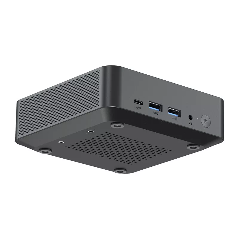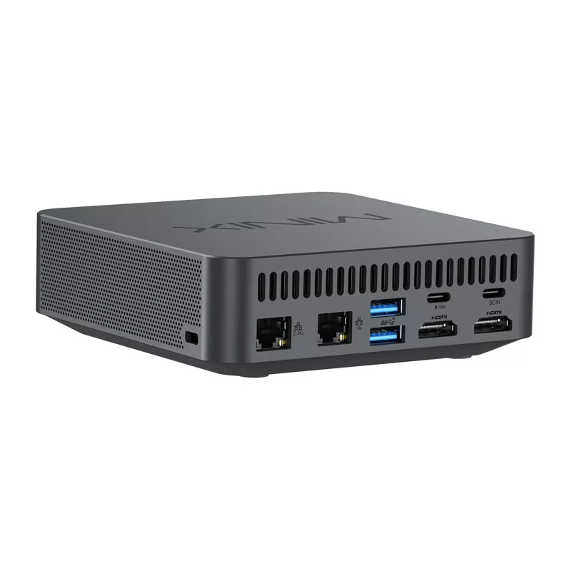 A kiváló minőségű fémötvözetből és műanyagból készült ház súlya mindössze 472 g, mérete pedig kevesebb, mint 119,3×119,3×38,9 mm, így bárhol könnyen elhelyezhető – VESA-kompatibilitásának köszönhetően akár a monitor mögött is. A Mini PC több USB 3.2 Gen 2 porttal (Type A és Type C), két LAN porttal (2,5G és 1G), audio csatlakozóval és Thunderbolt 4 támogatással rendelkezik. Az ilyen kiterjedt csatlakozási lehetőségek lehetővé teszik különböző kiegészítők és perifériák kompromisszumok nélküli csatlakoztatását.