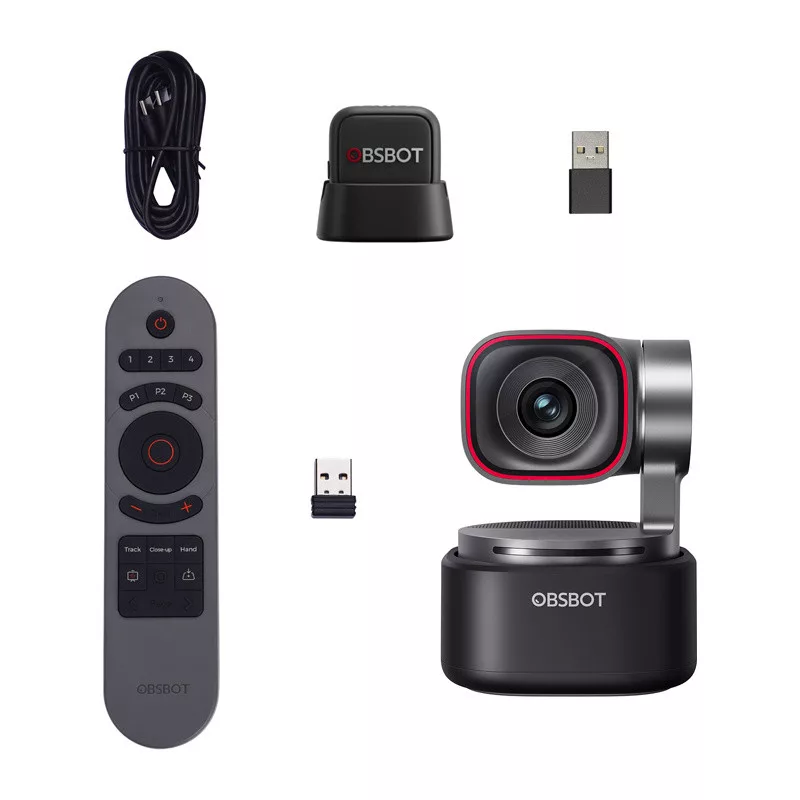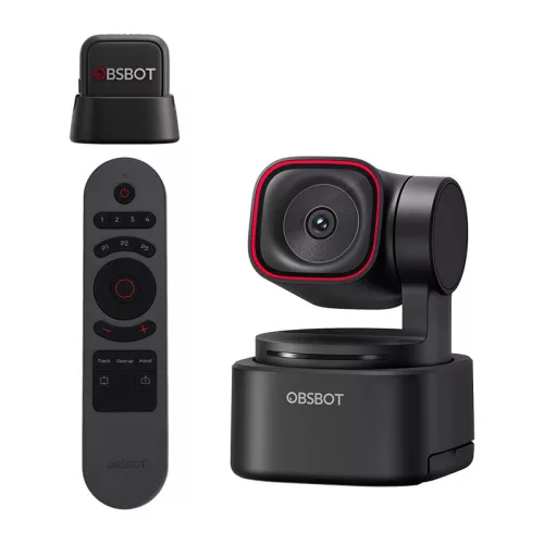 A készlet tartalmazza az OBSBOT Tiny Smart Remote 2-t, amely ötvözi a kamera távirányító és a prezentáló funkcióit. Egyetlen eszközzel manuálisan vezérelheti a gimbal mozgását, a zoomot és az előre beállított keretpozíciókat, valamint azonnal aktiválhatja a legfontosabb AI funkciókat, mint például a személykövetés, a zoom mód, az asztali mód és a kézkövetés. A távirányítóval kényelmesen vezérelhetők a prezentációk is, mivel gombokkal lehet váltani a diákok között, teljes képernyős módot lehet bekapcsolni, és lézerpointer is rendelkezésre áll, így praktikus eszköz képzésekhez, előadásokhoz és élő prezentációkhoz. A fizikai gombok és az ergonómikus elrendezésnek köszönhetően a kamera és a prezentáció vezérlése még dinamikus prezentációk során is intuitív, egér, billentyűzet vagy alkalmazás nélkül.