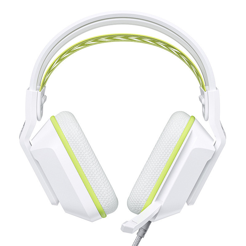 Fehér játékfejhallgató világoszöld háttérrel