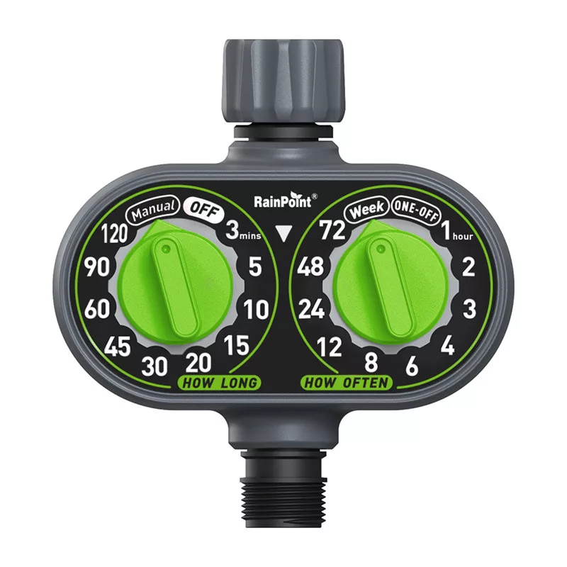 A vezérlő két független tárcsát használ – az egyik az öntözés időtartamát, a másik pedig az öntözés gyakoriságát szabályozza. Ez lehetővé teszi a pontos működési idő beállítását 3 és 120 perc között, valamint az öntözési időközök kiválasztását 1, 2, 3, 4, 6, 8, 12, 24, 48 vagy 72 óra, illetve a heti üzemmód között. Ezen felül rendelkezésre áll az Egyszeri üzemmód is, amely lehetővé teszi egy egyszeri öntözési ciklus gyors elindítását a fő beállítások megváltoztatása nélkül.