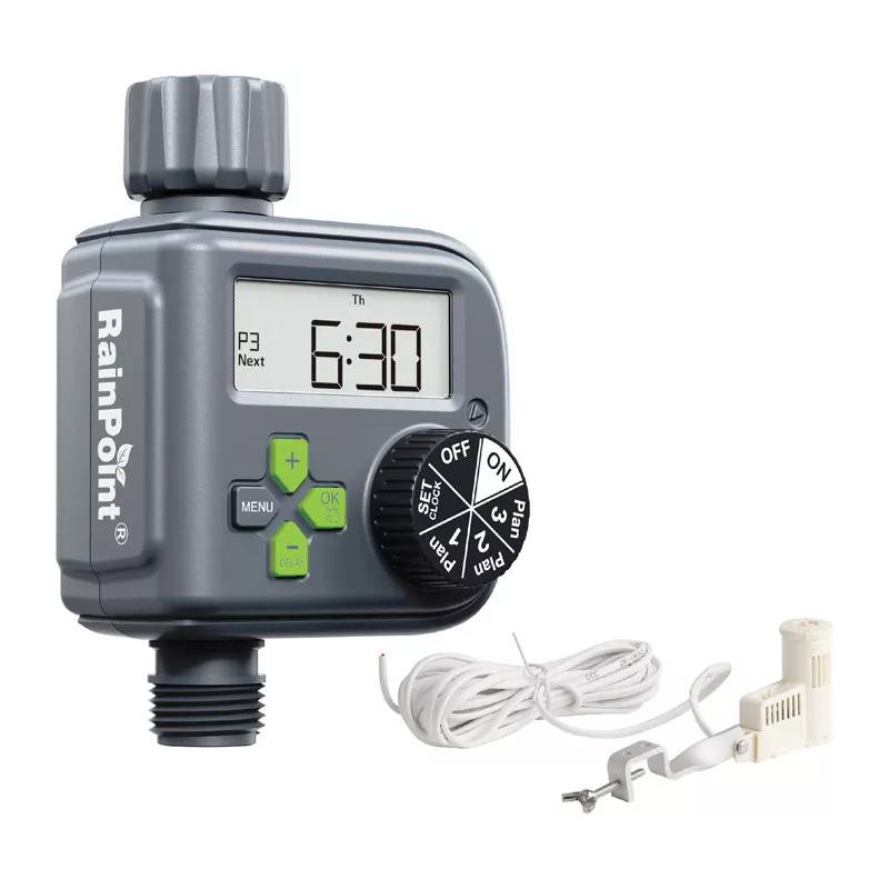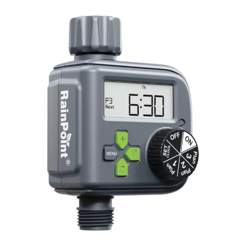 Automatizálja kertje öntözését és takarítson meg vizet a RainPoint vezérlővel, amely esőérzékelővel rendelkezik. A készülék segítségével legfeljebb 3 független öntözési ütemtervet állíthat be, a működési időt 0 és 90 perc között állíthatja be, valamint a gyakoriságot 6, 8 vagy 12 óránként, illetve 1–7 napos ciklusban állíthatja be. A beépített esőérzékelő rendszer automatikusan szünetelteti az öntözést eső esetén, a nagy LCD-képernyő pedig kényelmesen lehetővé teszi a beállítások vezérlését.