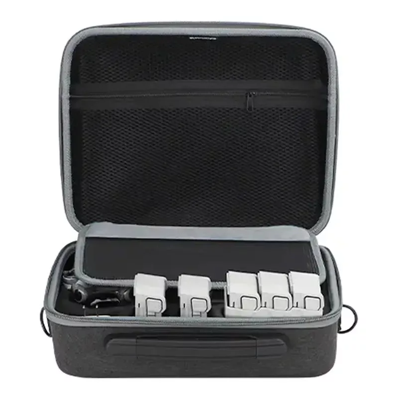 A táska felső és alsó részét egy puha anyaggal borított fal választja el egymástól, ami megakadályozza, hogy a felső részben tárolt tartozékok megkarcolják a drónt vagy a vezérlőt. A zseb hálóval van varrva, amely lehetővé teszi, hogy a felhasználó bepillantást nyerjen a tartalmába, így gyorsan felmérheti, hogy mindent bepakolt-e, amire szüksége van. A zseb cipzáras, hogy semmi se essen ki belőle.