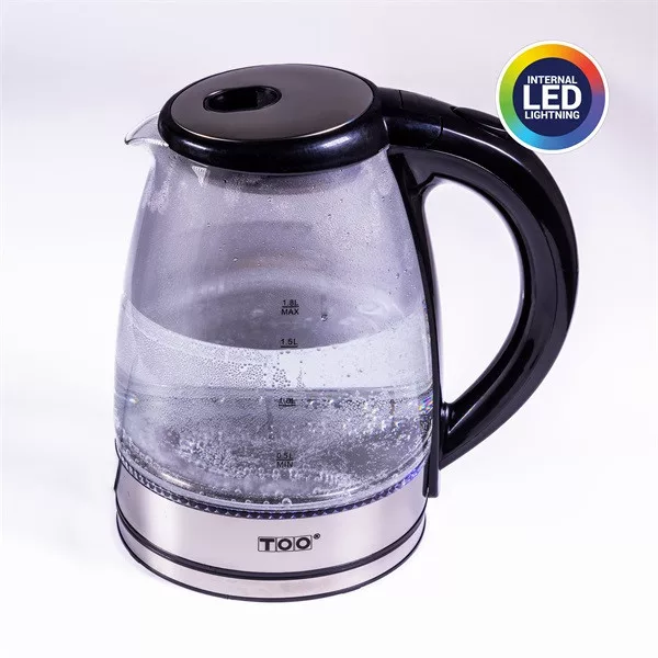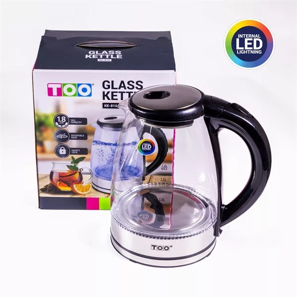 Élvezd a forró italokat ezzel a stílusos és biztonságos TOO KE-810 üveg vízforralóval! 1,8 literes kapacitásával tökéletes a család minden tagjának. A boroszilikát üveg kancsó elegáns megjelenést kölcsönöz konyhádban, miközben a belső LED világítás vizuális élményt nyújt a forralás közben.